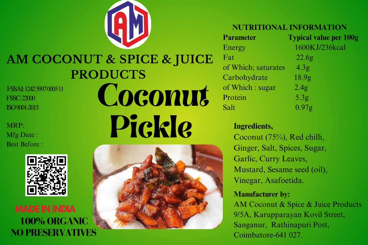 AM Spicy & Tasty Coconut Pickle is a premium-quality pickle made from carefully selected fresh coconut pieces blended with authentic traditional spices. Crafted using a time-honored recipe, it delivers a rich, spicy, and aromatic flavor that perfectly complements everyday meals. The natural sweetness of coconut combines beautifully with handpicked spices to create a bold and satisfying taste experience. Prepared under strict hygienic processing standards, this pickle ensures purity, safety, and consistent quality in every jar. High-quality edible oil and balanced seasoning help preserve freshness while maintaining its thick, flavorful texture. Free from artificial colors and unnecessary additives, AM Coconut Pickle offers a wholesome and authentic homemade-style taste. Perfectly suited for rice, dosa, idli, chapati, and curd rice, this delicious pickle enhances any meal with just a small serving. With its traditional flavor, premium ingredients, and hygienic preparation, AM Spicy & Tasty Coconut Pickle is a delightful addition to every kitchen.